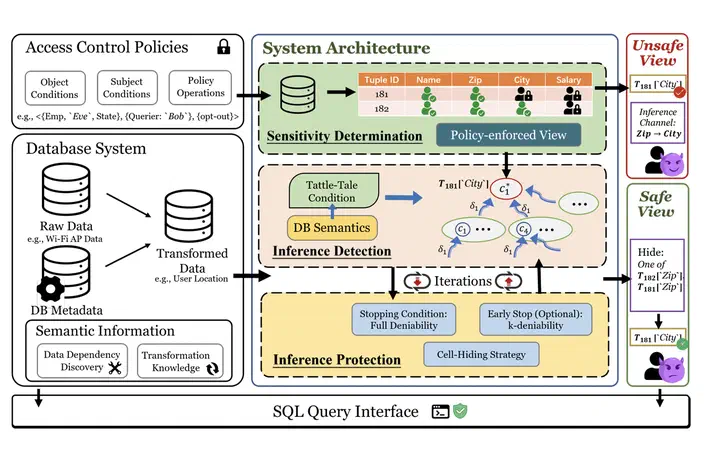 Image credit: UnsplashWe study the problem of answering queries when part of the data may be sensitive and should not be leaked to the querier. Simply restricting the computation to non-sensitive part of the data may leak sensitive data through inference based on data dependencies. While inference control from data dependencies during query processing has been studied in the literature, existing solution either detect and deny queries causing leakage, or use a weak security model that only protects against exact reconstruction of the sensitive data. In this paper, we adopt a stronger security model based on full deniability that prevents any information about sensitive data to be inferred from query answers.
